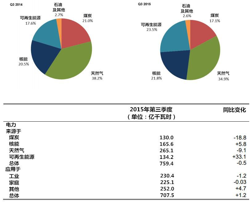 2015年第三季度电力生产中,天然气占比34.9%,而煤炭在减缩容量后占比17.1%,核电占比21.8%,此外,可再生能源发电占比23.5%,增长了5.9%。