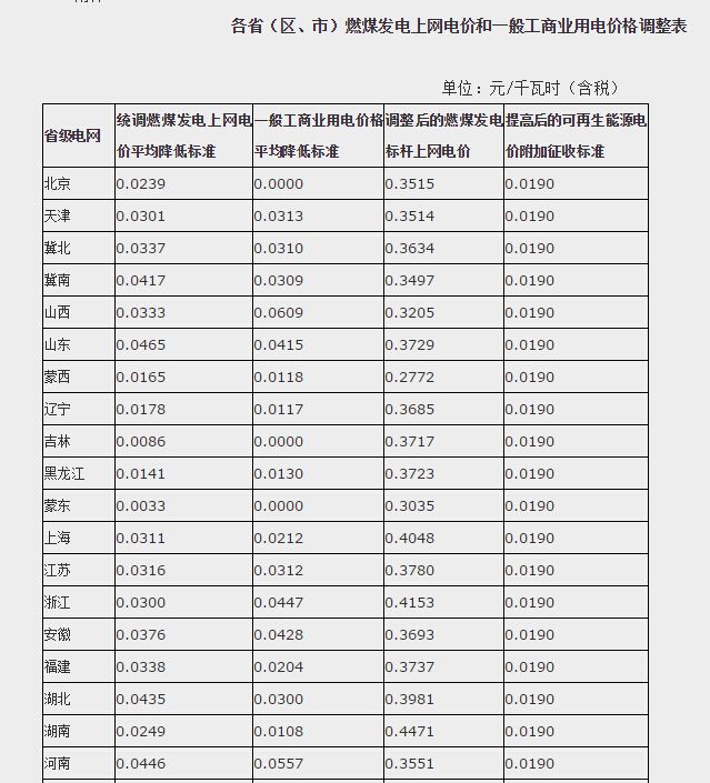 一、全国燃煤发电上网电价平均每千瓦时下调约3分钱(含税,下同),同幅度下调一般工商业销售电价,支持燃煤电厂超低排放改造和可再生能源发展,并设立工业企业结构调整专项资金。各省(区、市)燃煤发电上网电价平均调价标准和调整后的燃煤发电标杆上网电价见附件。