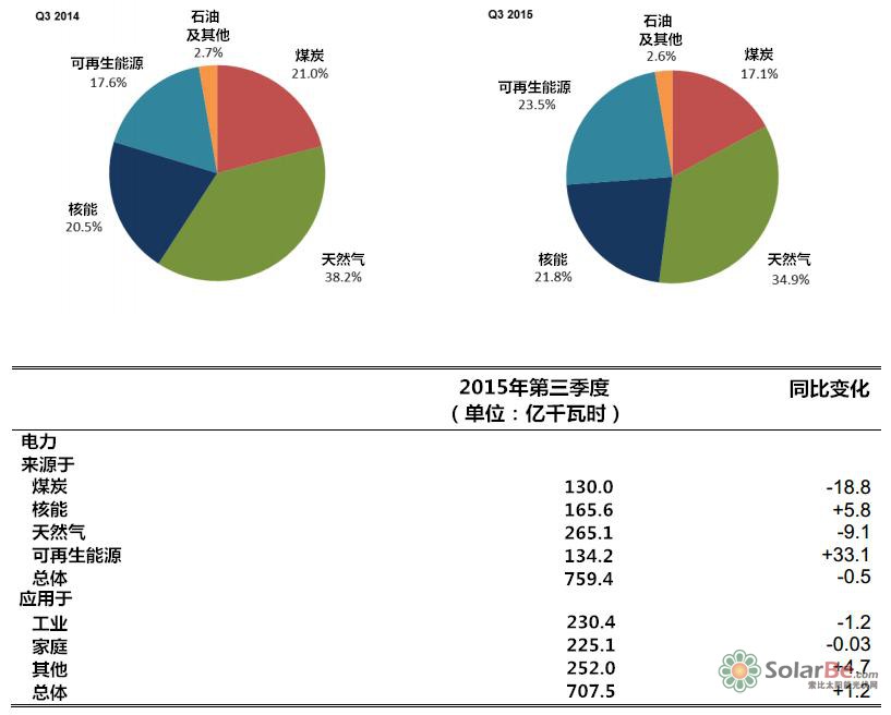 2015年第三季度电力生产中,天然气占比34.9%,而煤炭在减缩容量后占比17.1%,核电占比21.8%,此外,可再生能源发电占比23.5%,增长了5.9%。
