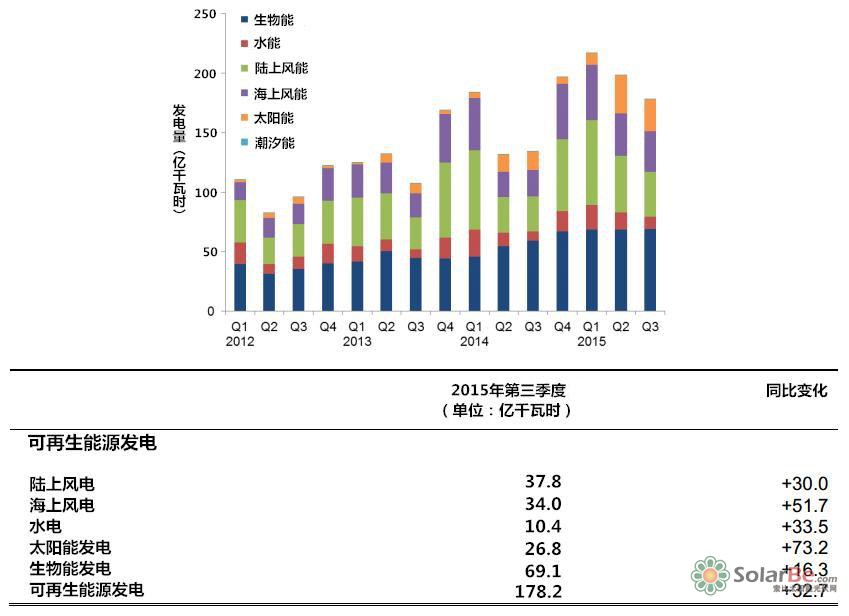 英国2015年第三季度可再生能源发电量为178亿千瓦时,相比去年同期的134千瓦时增长了33%。其中,太阳能发电增加最为明显,从去年同期的16亿千瓦时增长至27亿千瓦时,总体增长73%;生物能发电从去年同期的59亿千瓦时增长至69亿千瓦时,总体增长16.3%;受到高风速和装机容量增加的影响,陆上及海上风电分别增长30%和52%;水电增长33%,主要得益于降水的增加。
