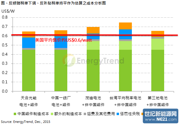由于陆厂税率偏高、且第三地电池产能稀少,2015年让不少大厂多以茂迪的电池片至第三地代工厂封成组件,茂迪因此吃足了税率优势的甜头,整年度出货畅旺。茂迪间接往美国的订单价格比其余台厂高了起码US$0.1/W以上,尤其下半年美国订单火热,更让茂迪的美国订单最高超过了US$0.355/W,约达15%左右的毛利。