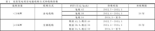 日本政府历来重视光伏发电技术的推广利用,推出一系列政策来促进光伏领域的发展。日本经济产业省等主要部委都推出并实施相关优惠政策来促进光伏产业的快速发展。2012财年日本经济产业省(METI)通过“支持引进住宅光伏系统的补贴措施”、“可再生能源上网电价补贴政策(FIT)”以及“引进可再生能源发电系统作为部分恢复措施的补贴计划”等支撑项目或措施来推动住宅和工业光伏系统的应用与普及。光伏发电项目电能收购方式和收购价格见表1。