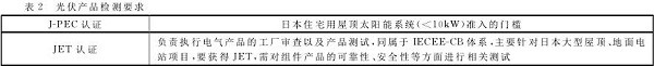 日本光伏市场认证壁垒较高。在日本,光伏产品有两个重要的认证,分别是日本太阳能发电普及扩大中心的J-PEC(Japan Photovoltaic Expansion Center)认证与日本电气安全环境测试实验室颁发的JET(Japan Electrical Safetyand Environment Technology Laboratory)认证,两者分别针对不同光伏发电系统市场的产品提出相关检测要求(见表2)。