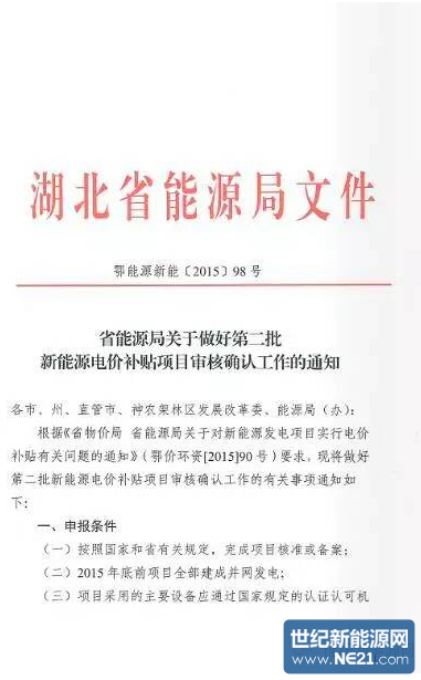 通知规定:获得项目核准和备案,并于2015年年底前建成的新能源项目,且主要设备应通过相应的国家认证可申请新能源补贴。风电项目必须获得特许经营权。