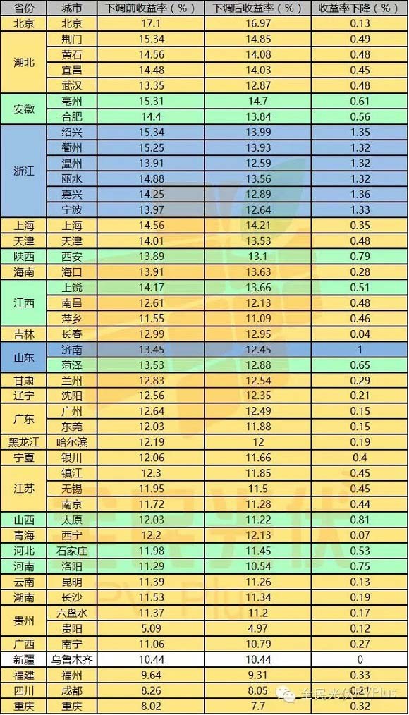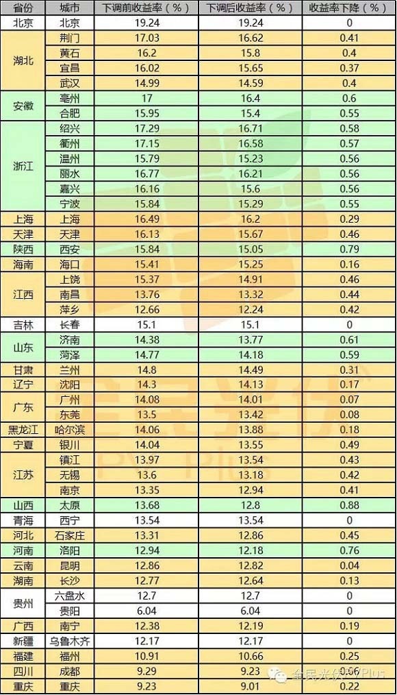 由于有些地方的工商业电价在此次调整中并没有下调,所以当自发自用比例为100%时,北京、吉林、青海、贵州等地的项目收益率均没有变化。
