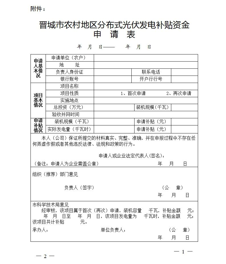 (一)晋城市农村地区分布式光伏发电补贴资金申请表(见附件)。