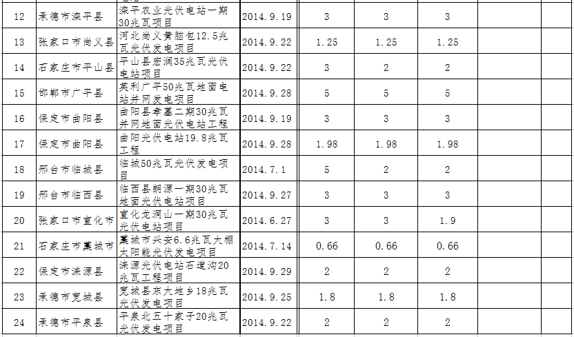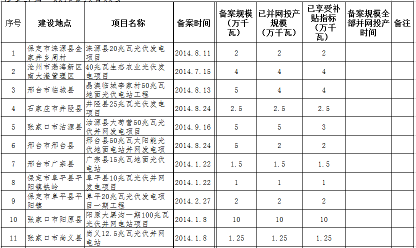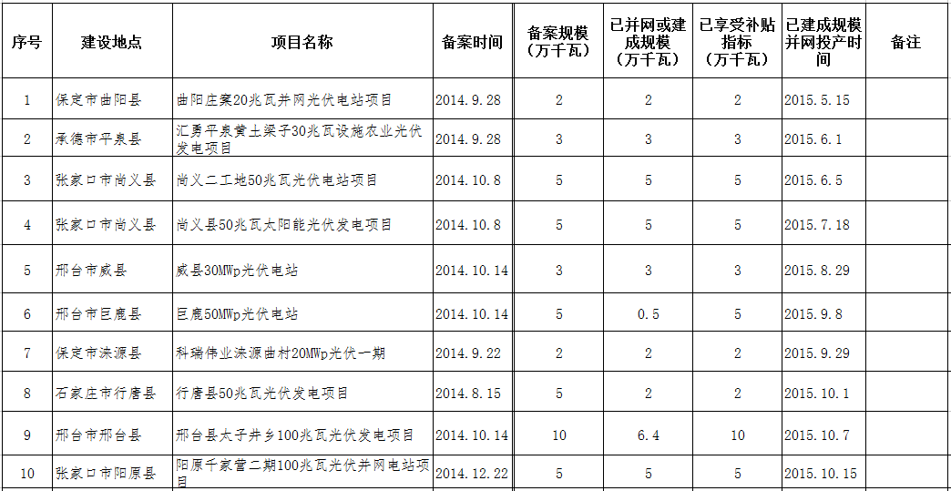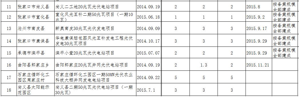 河北省2015年光伏发电计划安排中新增并网投产项目
