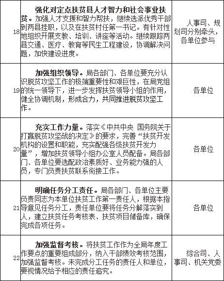 局各部门、各单位主要负责同志为本单位扶贫工作第一责任人,根据本指导意见任务分工,责任单位要将任务分解落实到人,建立扶贫任务考核表、扶贫项目储备库,确保完成各项任务。