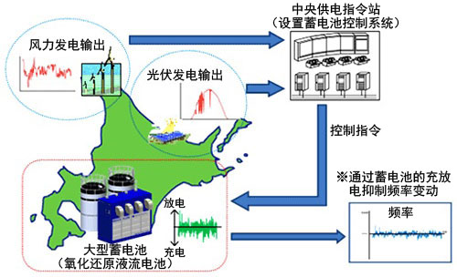 主要实证项目如下:(1)相应于光伏发电和风力发电的秒单位的剧烈输出变动进行充放电,抑制频率变动的“短周期变动对策”;(2)预测以小时为单位的光伏发电和风力发电输出变动,并加以平抑来保持供需平衡的“长周期变动对策”;(3)对光伏发电和风力发电输出功率急剧增加,而削减火力发电输出仍无法应对时的“成本较低对策”;(4)氧化还原液流蓄电池的性能评测;(5)大型蓄电系统的性能评测;(6)系统效率评测等。