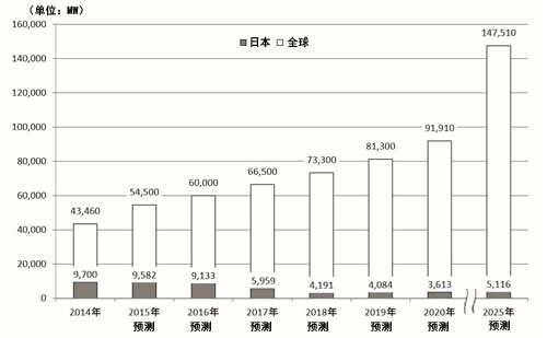 全球及日本的太阳能电池板市场规模(按容量计算)(出处:矢野经济研究所)