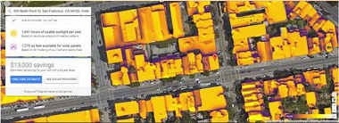 去年夏天,谷歌在加州和马萨诸塞州推出Project Sunroof计划,通过结合谷歌地图的鸟瞰图信息与屋顶遮挡数据、当地天气模式、行业定价及可用补贴,对太阳能安装项目成本进行评估。