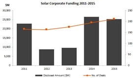 太阳能行业全球企业融资,包括上市公司筹集的创业投资/私募股权投资(VC)、债务融资和公开市场融资总共达253亿美元,2014年为265亿美元。