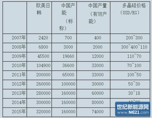 表1 2007~2015年全球太阳能级多晶硅产量和地区分布(产量:吨)
