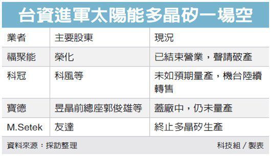 多晶硅是茂迪、昱晶、新日光等硅晶太阳能电池厂,生产太阳能电池的最上游关键材料,台湾先前共有福聚能、科冠、宝德等业者投入。其中福聚能虽曾小量产出,但随后因营运不善宣布破产。