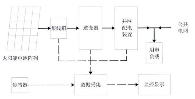 光伏并网系统主要由光伏阵列、并网逆变设备、数据采集及监控系统、阵列架体、交、直流电力网络、交流配电柜组成,系统示意图如下图。