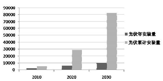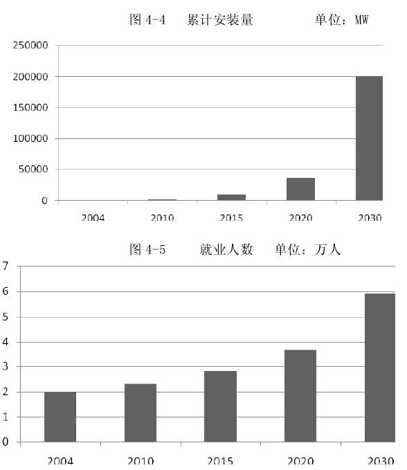 下一页>美国的财税政策呈现出另一种思路,它由国家制定全面的产业规划,大量综合应用税收、补贴手段,全面扶持光伏产业的发展。首先,由于有了联邦政府的大量投资和明确的规划,国内光伏产品的安装量出现了快速增长,就业人数有了显著上升,下图是2004年,美国政府发布了“我们太阳电力的未来:2030及更久远的美国光伏工业路线图”发表之后,根据2004年和2010年美国国内光伏电力累计安装量预计2015--2030年的累计安装量(图4-4)和就业人数(图4-5),如下图所示: