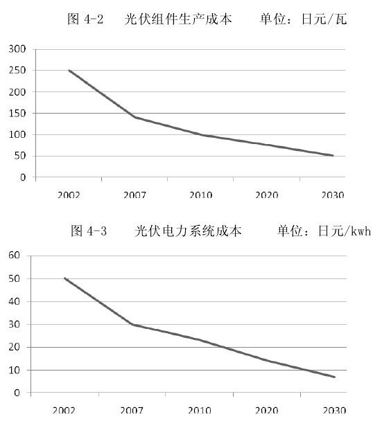 麻生太郎提出了经济刺激计划对光伏产业进行大量投资后,根据光伏组件(图4-2)和光伏电力(图4-3)现有的成本情况,对2020年和2030年作出了预测,如下图所示: