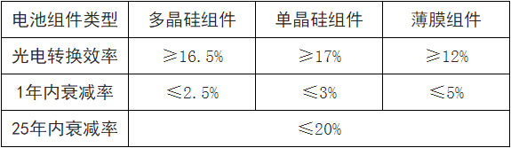 新建光伏电站使用的电池组件,要严格按照《国家能源局工业和信息化部国家认监委关于促进先进光伏技术产品应用和产业升级的意见》(国能新能〔2015〕194号)“领跑者”计划标准选取。多晶硅电池组件、单晶硅电池组件、薄膜电池组件的光电转换效率、衰减率等指标必须符合规定。