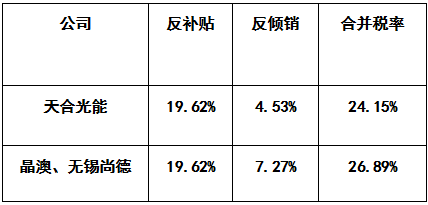 索比光伏网讯:2012年中美双反第一次重审刚于今年七月落幕,第二次重审又来势汹汹,近期公布初判结果,终判则在2016年年中才能尘埃落定。TrendForce旗下新能源事业处EnergyTrend观察,初判进度反倾销上月已有定论,反补贴则于一月八日公布天合光能、晶澳、无锡尚德三间厂商由去年的20.94%下调至19.62%,天合光能成最大赢家,合并税率仅24.15%。如用天合在中国大陆本土的成本US$0.45/W左右输美,整体组件成本仍可控制在US$0.58/W以下,相比使用茂迪电池片至第三地封成组件需要超过US$0.60/W,使用本土产能将更有优势。