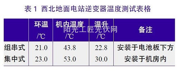西部地面电站,组串式逆变器安装在组件上,环境开旷、通风好,逆变器散热良好;集中式逆变器安装在机房中,由于西北地区风沙严重,集中式逆变器机房中积灰导致防尘网堵塞、整机散热性能变差,大功耗器件温度急剧上升,引起温度告警,更严重时会导致内部IGBT器件损坏,设备不断重启,甚至烧坏。表1为西北地面电站逆变器温度测试结果。可看出,由于集中式逆变器安装于机房内,温升比组串式高,在炎热夏天,机房内温度超过50℃是经常的事情,集中式逆变器柜体内温度更高更恶劣,而高温带来的是器件寿命降低、整机降额运行,甚至炸机隐患。今年上半年以来,几乎每月都有因为散热问题导致集中式逆变器出现炸机等严重事故。
