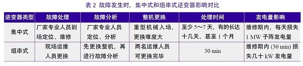 故障发生时,集中式一般需厂家的专业人员到场定位及维修,处理时间长,发电量损失大;而组串式逆变器可直接由现场运维人员进行更换处理,简单快捷,先保证发电,然后再对故障机器进行分析、维修。表2说明了集中式逆变器和组串式逆变器故障维护差异及对系统的影响程度。