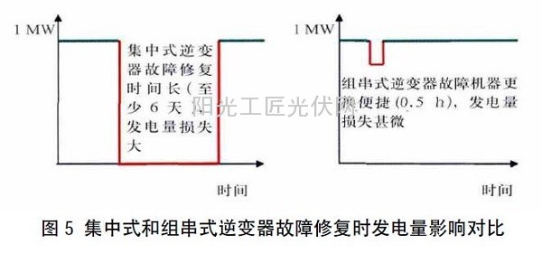 通常,由于受软件和硬件匹配等影响,集中式逆变器必须使用原厂家的备件,一旦厂家倒闭,未来维护将会被迫中断;而组串式逆变器5年维保期内,免费替换,质保期外的故障机器,可借助现代物流平台返厂维修,仅需收取少量维修费用;若某些组串式品牌若干年后倒闭或已不存在,也可重新更换一台其他品牌的组串式逆变器,更换成本较低,对系统整体发电量的影响甚微。因此组串式逆变器维护成本远低于集中式逆变器。集中式逆变器和组串式逆变器故障修复时对发电量的影响如图5所示。
