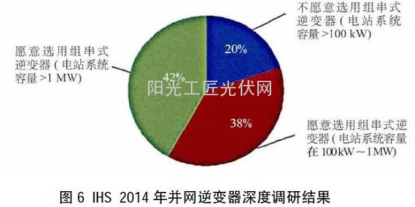 在过去10多年逆变器的发展过程中,欧洲的技术领先全球市场2~3年,是技术和市场的风向标;中国、美国和日本等市场,基本上是跟随欧洲的路线,同时吸收欧洲的经验和教训。现在以SMA为代表的技术厂家在美国和欧洲正在力推组串式方案。国内越来越多的光伏电站也正在采用组串式方案。可见,组串式正在成为光伏电站建设的主流方案。图6为2014年IHS调研组串式逆变器使用情况调查结果。