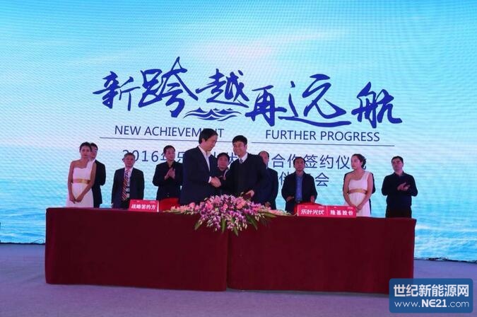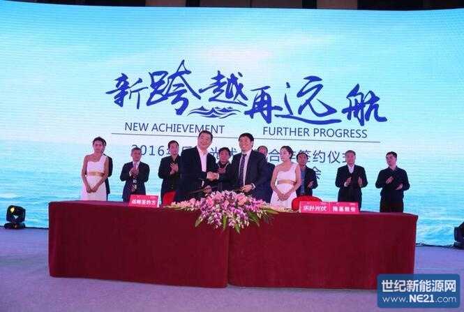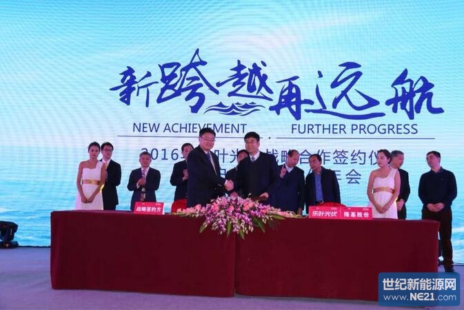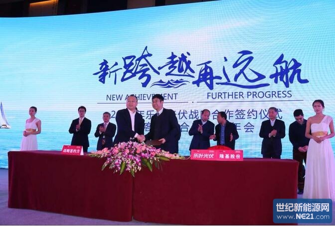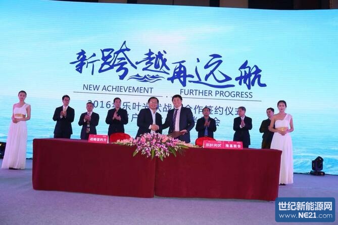 在晚上举行的乐叶光伏2016年客户与合作伙伴年会上,陕西省工信厅副厅长许蒲生、陕西省扶贫开发办公室副主任丁济民、陕西省质量技术监督局副局长高阳、中国光伏行业协会秘书长王勃华、全联新能源商会副会长兼秘书长曾少军、国家现代农业光伏产业协同创新战略联盟理事长孙耀杰、中国机电产品进出口商会太阳能光伏产品分会副秘书长张森和西安隆基硅材料股份有限公司董事长钟宝申、总裁李振国,以及数百位业界精英共同见证了乐叶光伏乃至整个光伏界的开年大事件——乐叶光伏及母公司隆基股份分别与六家光伏电站投资商签订了为期3年的战略合作协议,根据相关协议,战略合作伙伴将在2016~2018年间从乐叶光伏和隆基股份采购9.6GW单晶组件、3GW单晶硅片/电池片。