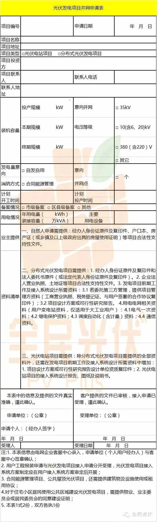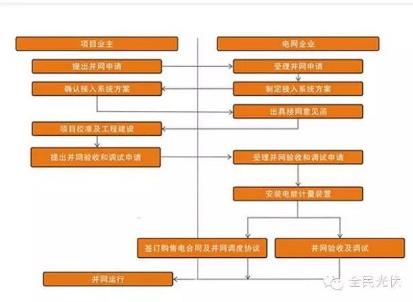 并网申请流程个人用户需要带上身份证、户口本、房产证等相关材料办理,企业用户带上营业执照、法人代表身份证、土地证、房产证、项目材料等相关材料到当地供电营业厅办理申请→业主提出并网申请,到当地的电网公司进行备案→电网企业受理并网系统方案,并制定接入系统方案→业主确认接入系统方案,并依照实际情况调整重复申请→电网公司出具接网意见函→业主进行项目核准和工程建设→业主建设完毕后,提出并网验收和调试申请→电网企业受理并网验收和调试申请,安装电能计量装置(原电表改装成双向电表)→电网企业并网验收及调试,并与业主联合签订购售电合同及并网调度协议→正式并网运行