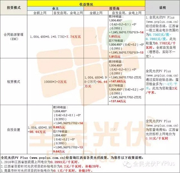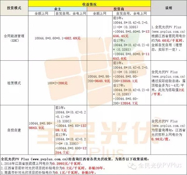 若您家的屋顶面积为100平米(电价可参考上文中2015年福建电网销售电价表),则其装机容量或为10KW,年发电量或为1.005万度(中间过程取值均为估算值,因此与实际情况或有出入。如需针对具体项目进行精准设计、测算,可联系全民光伏PVPlus为您提供免费开发顾问服务),则您的收益可能为: