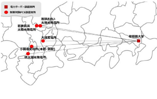 具体为,将早稻田大学EMS新宿实证中心设置的输出控制指令发送服务器与堺光伏电站、若狭大井、若狭高浜光伏电站等关西电力所属的6座光伏发电设备,以双向通信方式连接,并预定在2月中旬之前进行输出控制的实证试验。