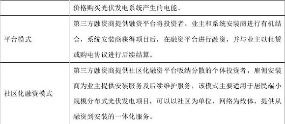 随着分布式光伏发电在国内的逐步推广,国内光伏产业的金融支持模式将由原先传统的光伏电站式的信贷融资模式逐步过渡到以中小型业主为主的创新型分布式光伏融资模式。按照国外的成熟经验,分布式光伏的主要经营模式包括业主自主投资模式和第三方融资模式,即业主通过自主投资模式或者第三方融资商的模式,委托安装商将并网光伏系统安装在自己的屋顶,系统产电主要供业主自己使用,多余电量可并入电网。目前,较为成熟的做法是引入第三方融资作为资金和技术支持,此举一方面有助于降低安装成本,另一方面将对项目的顺利施工和后续的维护保养提供良好的保障。