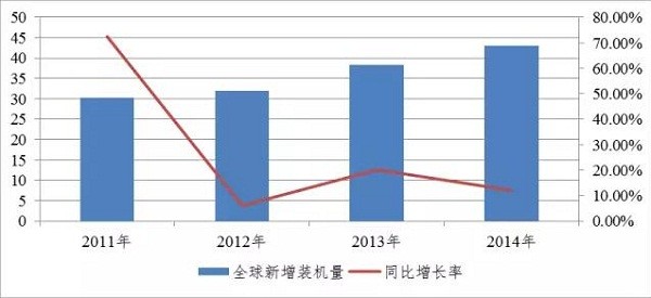 图表4.2011~2014年全球光伏新增装机量和同比增长率情况(单位:GW,%)