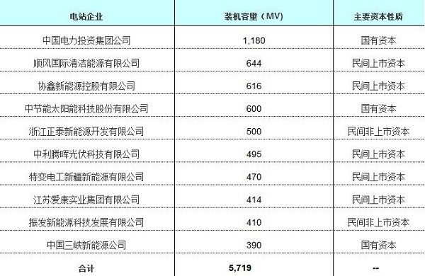 光伏上网电价显著高于火电0.41元/千瓦时和水电0.32元/千瓦时的上网价格。20年电价补贴所形成的持续现金流,以及较高的投资收益率(IRR),吸引了大量资金涌入光伏行业。根据PVP365统计,2014年全国光伏装机投资前10家企业的装机容量合计5.72GW,其中3家国有企业,5家上市公司,剩余2家为非上市民营企业。