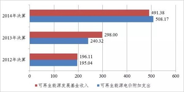 图表8.2012~2014年我国可再生能源发展基金支出和收入情况(单位:亿元)