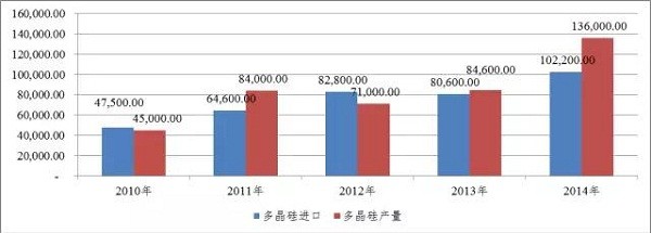 图表10.2010~2014年我国多晶硅进口量与国内产量的情况(单位:吨)
