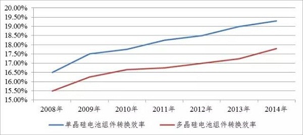 从技术水平看,我国光伏行业近年来通过加大工艺技术研发力度,生产工艺水平不断进步。2014年多晶硅生产平均综合能耗下降至110kwh/kg,部分企业已低于70kwh/kg。我国产业化生产的高效多晶硅电池平均转换效率达到17.8%,单晶硅电池平均转换效率达到19.3%,处于领先水平。在高效电池研发与生产上,多次印刷、PERC技术、HIT技术、IBC技术、MWT技术、黑硅技术等已在使用或着手研发,部分企业生产的N型电池转换效率已达到22.9%,处于全球先进水平。主流组件产品功率达到255-260W,同比提高近6%。