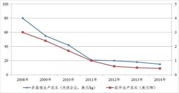 从生产成本看,在生产工艺水平的驱动下,我国光伏产品生产成本不断降低。2014年多晶硅生产成本降至15美元/kg,光伏企业的晶硅组件生产成本下降至0.45美元/kg,系统装机成本降至8-9元/瓦,部分分布式装机降至6元/瓦。