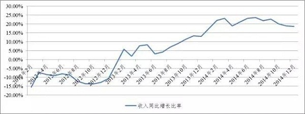 图表13.2012~2014年光伏设备及元器件制造业行业累计产品销售收入同比增长率(单位:%)