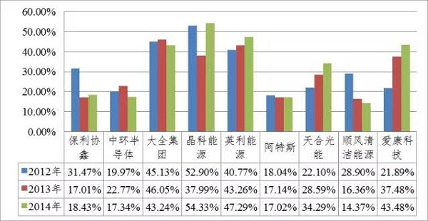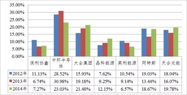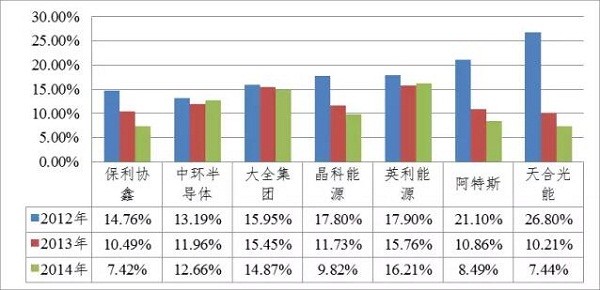 图表16.2012~2014年光伏中上游主要企业期间费用率情况(单位:美元/瓦)