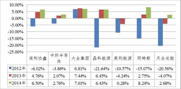 图表17.2012~2014年光伏中上游主要企业净利润率情况(单位:美元/瓦)