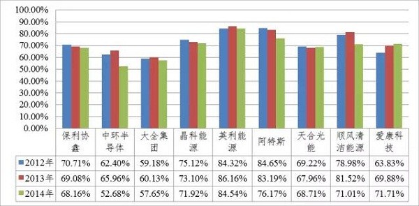 图表20.2012~2014年光伏主要企业资产负债率情况(单位:美元/瓦)