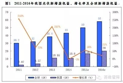 图3 2011-2016年我国光伏电池组件产量、增长率及全球光伏电池组件产量