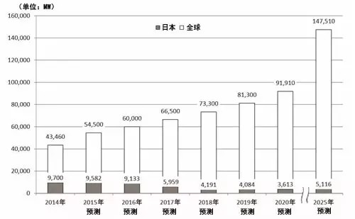 关于从接单到施工的前置时间较短的住宅市场,“因2014年秋季实施的并网搁置使得消费者的购买意愿降低,造成了供货低迷”(光伏发电协会)。而非住宅市场方面,认证而尚未运转的项目还剩余约58GW以上,因此最近几年估计供货会保持坚挺。多家民间调查公司预测,2016年的光伏发电市场将与2015年相同,继续保持8~9GW的高水平。