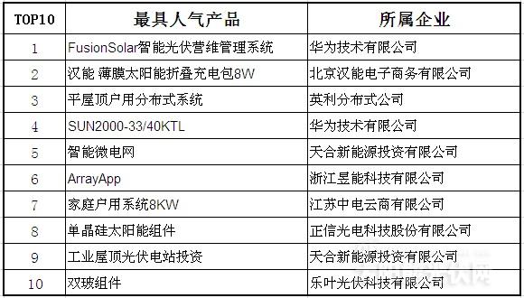 在展会过程中,观众不仅可以观赏各种光伏产品,还可以为自己喜欢的光伏产品留言点赞。主办方针对所有参展商展出的光伏产品,按展品被浏览数、留言数、资料下载数等项目分值综合评估,经过OFweek专业团队认真筛选和评定,最终评选出本次光伏在线展上10大最具人气光伏产品,评选结果公布如下: