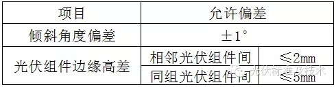 光伏组件常见的安装方式有两种,即螺栓安装和压块安装。无论哪种安装形式,都需保证组件固定螺栓的力矩值满足产品或设计文件的规定。另外,压块安装方式还需特别注意边压块和中压块虚压问题。光伏组件安装时宜按照组件的电压、电流参数进行分类和组串,光伏组件安装允许偏差应符合下表规定。