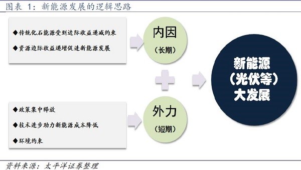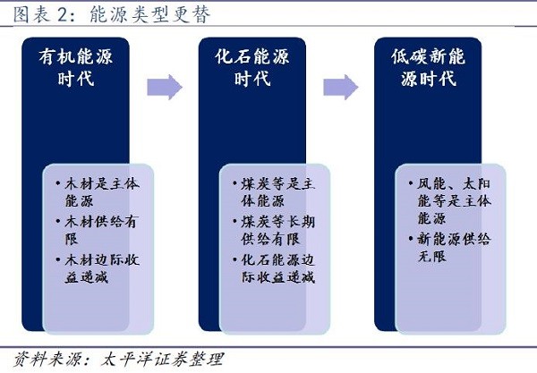 内因:传统能源边际收益递减加速新能源替代。从长期来看,人类对能源利用经历了有机能源时代,化石能源时代,目前正在向低碳能源时代过渡。大规模利用化石能源所带来的环境成本上升使化石能源对社会的边际收益递减,风电、光伏等新能源替代化石能源是能源演进内在规律使然。
