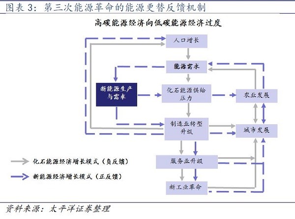 在新能源替代传统能源的趋势下,经济增长的模式也从高碳能源经济向低碳能源经济过渡。新型工业化、信息化、城镇化和农业现代化的快速发展,使三次产业的能源利用效率提升,逐步摆脱对传统化石能源的依赖,从而保持经济的可持续增长。