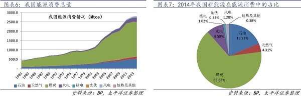 我国新能源在能源总消费中的占比很小。2014年,风电、核电、光伏、地热及其他占总体能源消费的比例分别是:1.28%、1.02%、0.23%、0.38%,新能源合计占比不超过3%,仅为2.91%。但正因为目前的占比小,未来的发展空间很大。在今后的能源替代中,新能源占比每上升一个百分点,行业增长将会达到30%左右。
