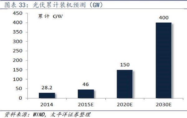 中国光伏业协会数据表明,2015年前三季度,光伏新增装机约为10.5GW,同比增长177%,全年完成17.8GW是大概率事件。国务院下发的《能源发展战略行动计划(2014-2020年)》显示,到2020年,非化石能源占一次能源消费比重达到15%。“十三五”光伏装机目标初定为150GW,那么,“十三五”期间每年需新增约20GW左右的光伏装机才可实现该目标。根据中国光伏业协会预计,到2030年光伏装机目标在400GW,这意味着2021年至2030年年均新增25GW以上的规模,可以说2015年是光伏装机规模化元年,光伏行业将进入装机规模化“新常态”。